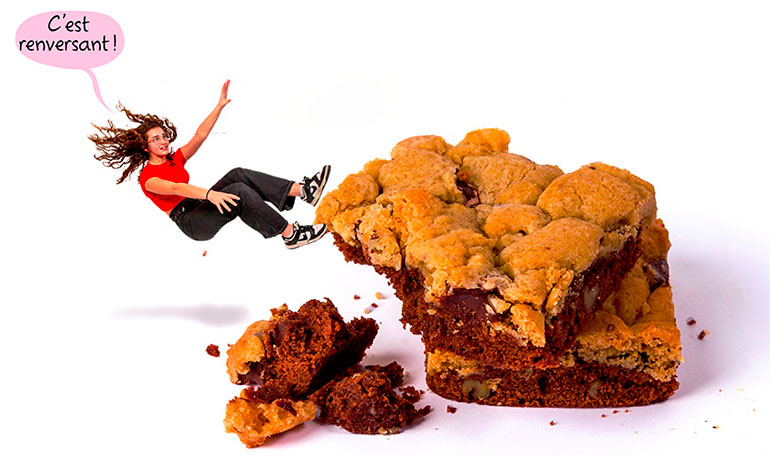 •Pour la pâte à brownie, fais fondre le chocolat avec le beurre, ajoute le sucre, les œufs et la farine, verse dans un moule et enfourne dans un four préchauffé à 150 °C.