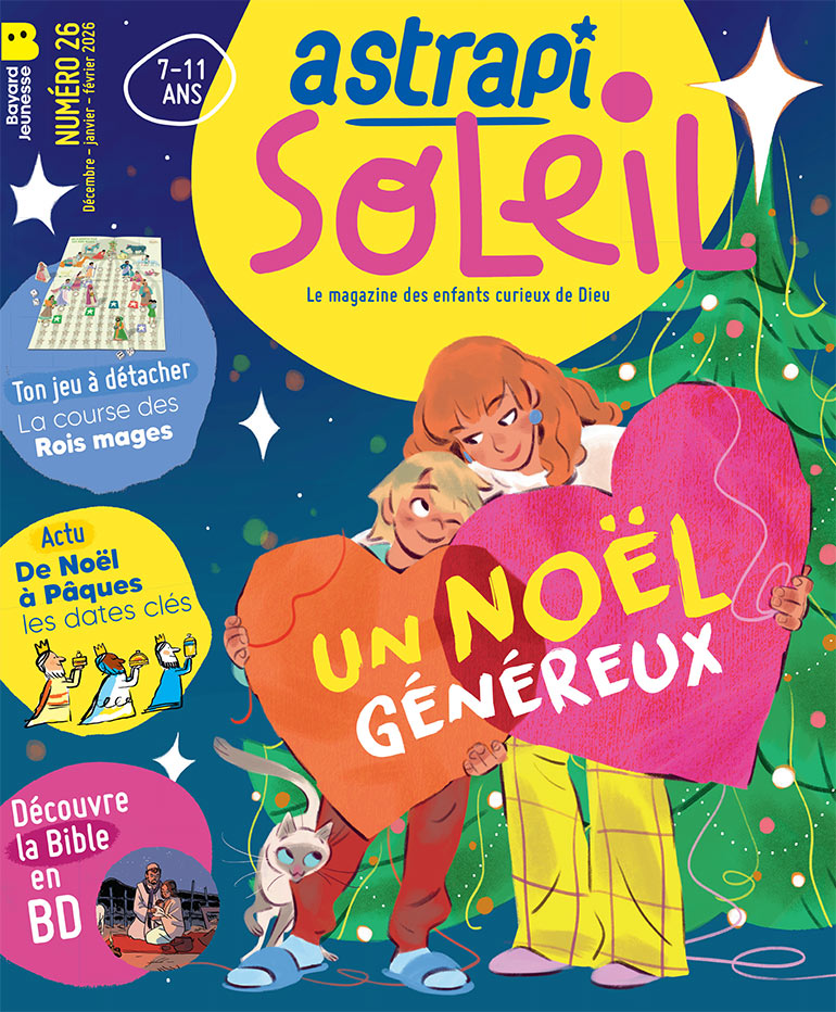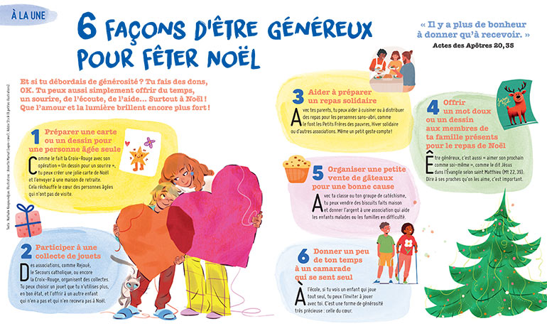 Cette année, Astrapi Soleil propose aux 7-11 ans “6 façons d’être généreux pour fêter Noël” et de déborder de générosité. Pas seulement en faisant des dons, mais en offrant aussi du temps, un sourire, de l’écoute, de l’aide…