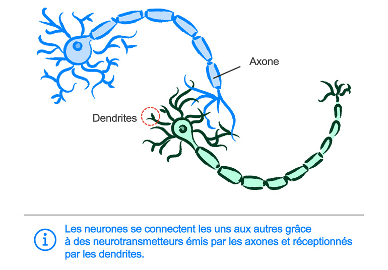Lorsqu’un influx nerveux arrive au bout d’un axone, il provoque le relâchement de neurotransmetteurs qui, une fois captés par les dendrites du neurone voisin, permettent son activation. C’est grâce à ce mécanisme que les neurones se connectent les uns aux autres. Tout cela se fait très vite et tout le temps, y compris quand on dort : un neurone est généralement connecté à 10 000 autres !