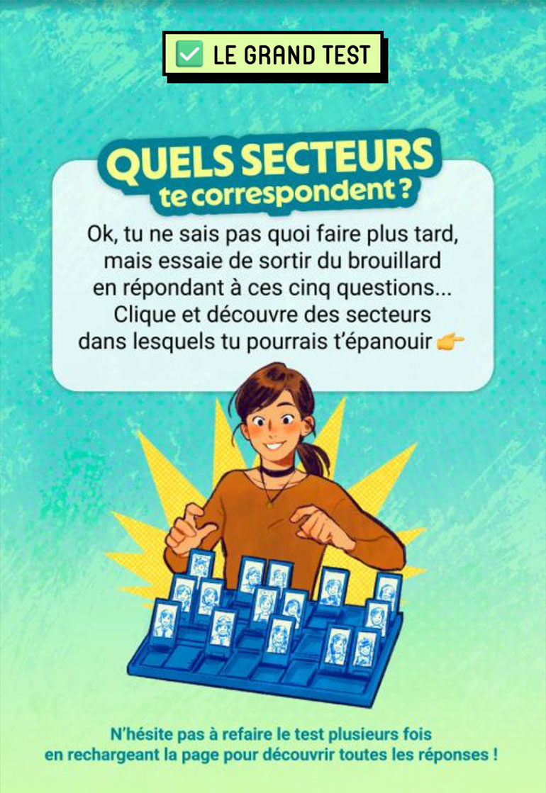 Les lecteurs y découvriront un test pour les aider à identifier les secteurs qui pourraient leur correspondre. Ils pourront aussi scroller un arbre décisionnel pour savoir s’ils sont plutôt faits pour une prépa, un BUT, une licence, un BTS… avant de répondre à un quiz qui déterminera s’ils sont prêts à tirer le meilleur d’un salon étudiant (et éviter de repartir avec une simple collection de goodies).