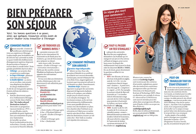 Après le bac, votre enfant souhaite partir étudier et/ou travailler dans un pays étranger ? Le magazine I Love English World (dès 15 ans) pointe les bonnes questions à se poser, et lui fournit des ressources utiles pour faciliter son envol.