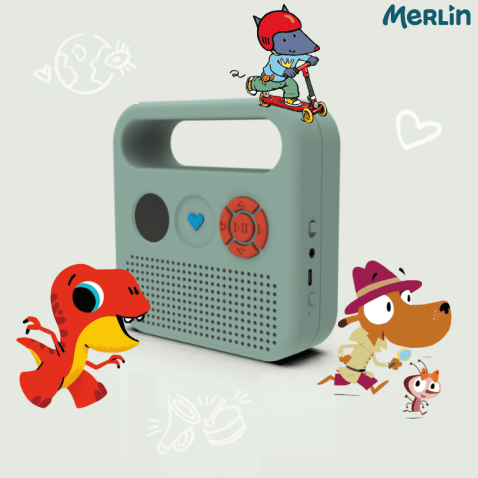 Découvrez MERLIN, une enceinte conçue pour les enfants ! Petite et légère, avec une prise casque et 10h d’autonomie, elle s’emporte partout !